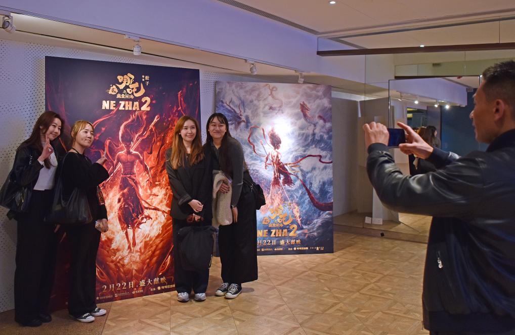 2月18日,觀眾在香港一家電影院與《哪吒之魔童鬧?!沸麄骱蠛嫌?。新華社記者 陳鐸 攝