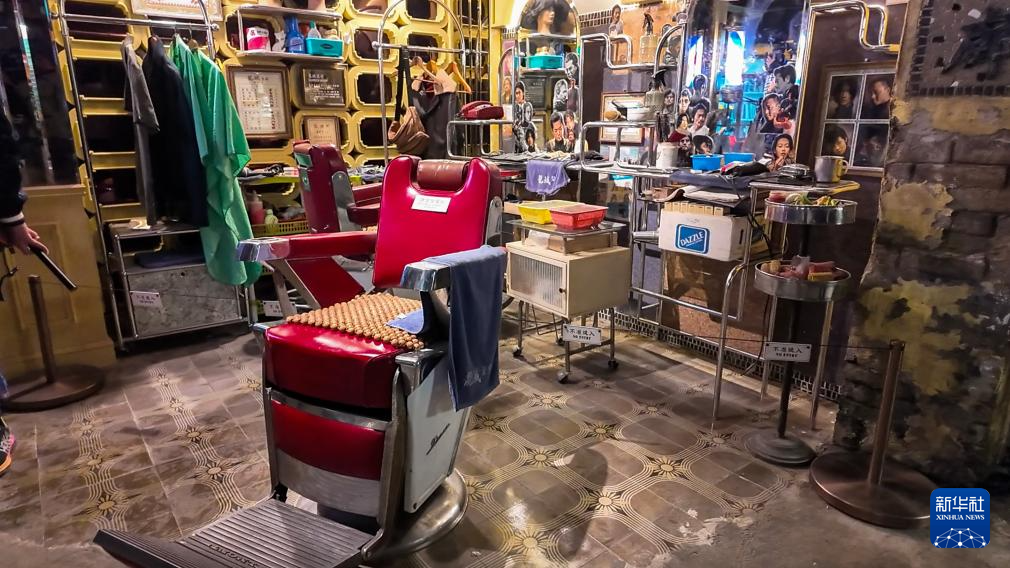 《九龍城寨之圍城》電影展覽內的復古風格理發店(2024年12月16日攝)。新華社發(龍鏡伊 攝)