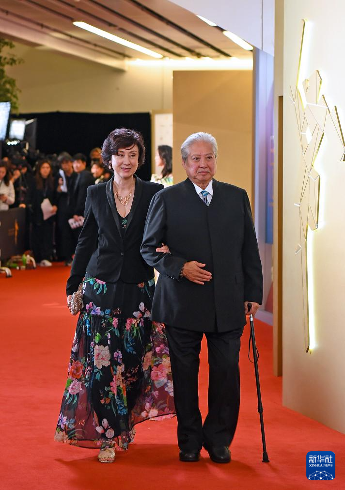 3月16日,第18屆亞洲電影大獎評審主席洪金寶(右)在紅毯亮相。新華社記者 陳鐸 攝