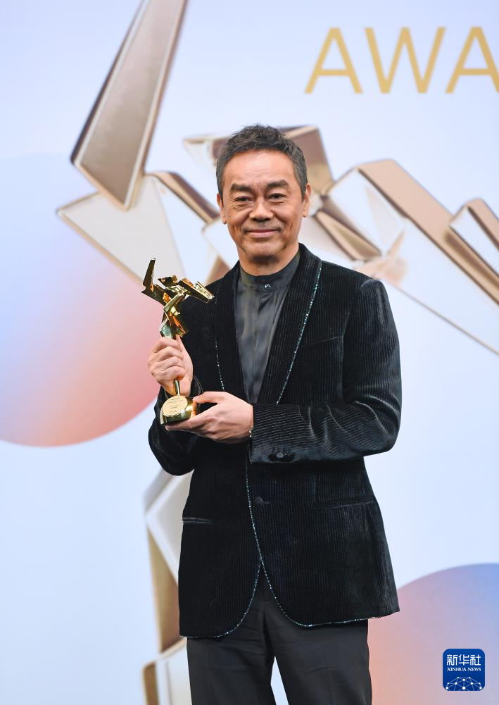 3月16日,獲頒最佳男主角的演員劉青云展示獎杯。新華社記者 陳鐸 攝
