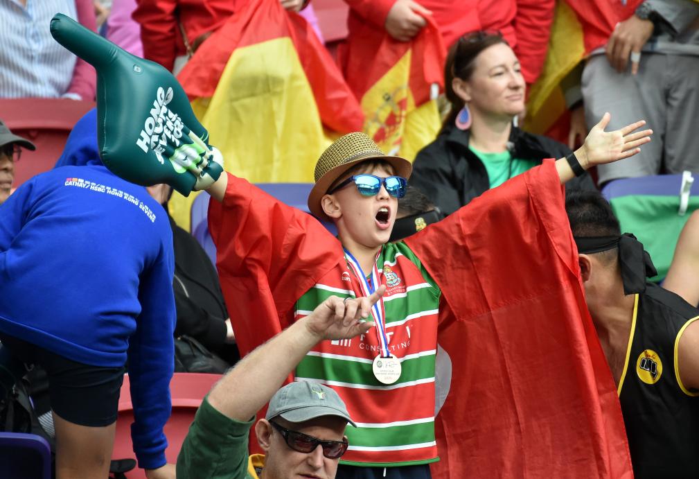 3月29日,一位小球迷在香港啟德體育園觀看香港國際七人橄欖球賽。新華社發(盧炳輝攝)