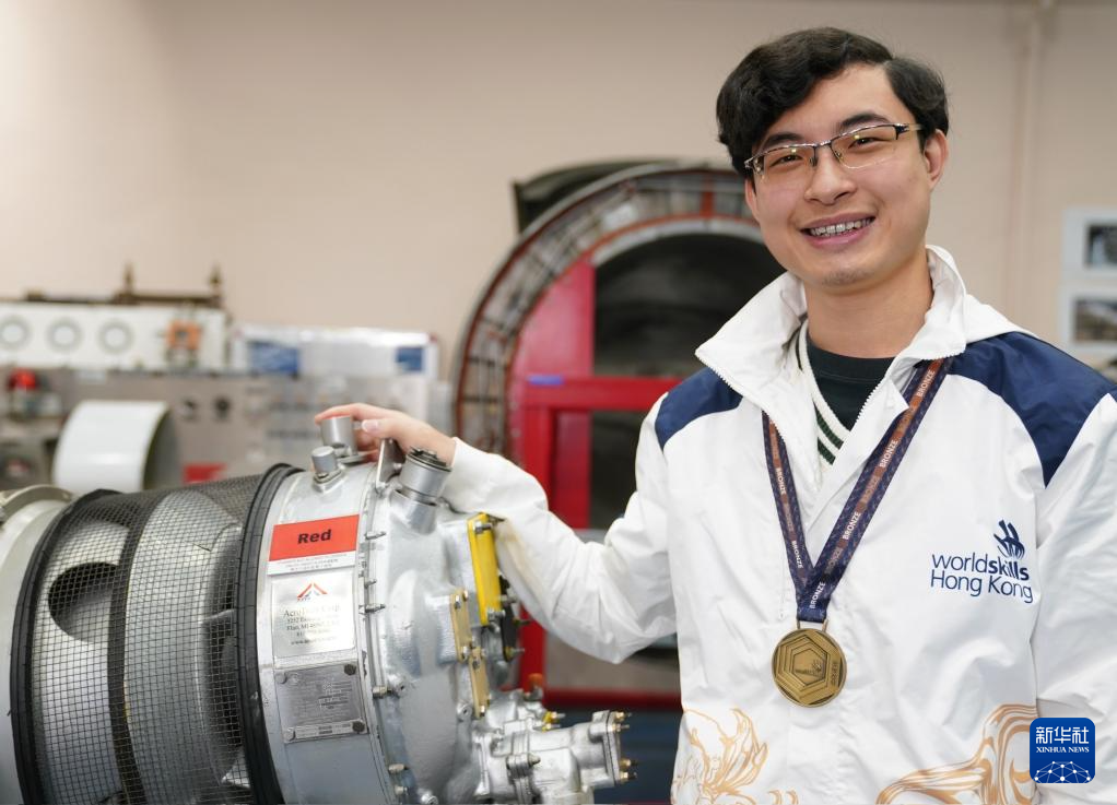 在香港專業教育學院,黃富東佩戴著“2024年里昂世界技能大賽”飛機維修項目的銅牌和渦輪螺旋槳飛機引擎合影(1月14日攝)。新華社發(王申攝)