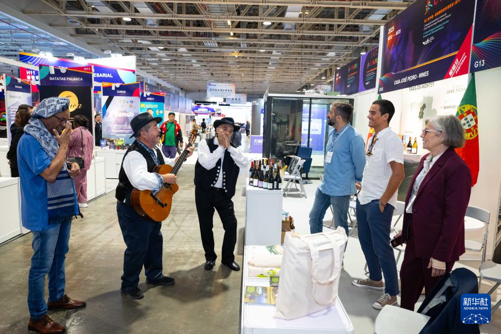 10月22日,演員在第二屆中國—葡語國家經貿博覽會(澳門)上與參展者互動。新華社發(張金加 攝)