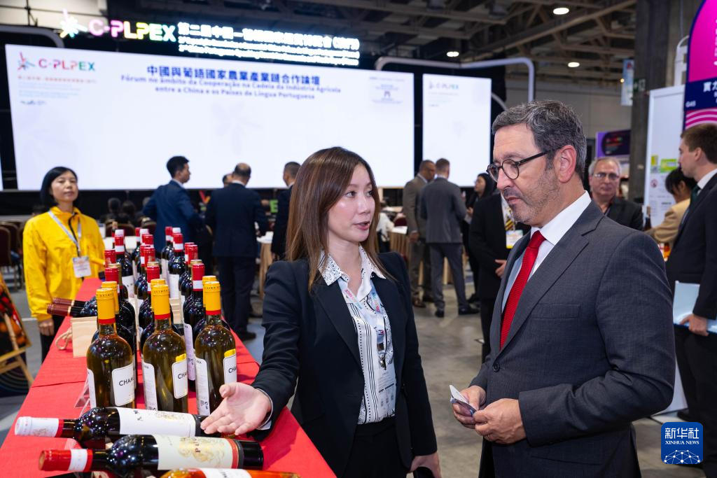 10月22日,工作人員在第二屆中國—葡語國家經貿博覽會(澳門)展臺介紹葡萄酒。新華社發(張金加 攝)