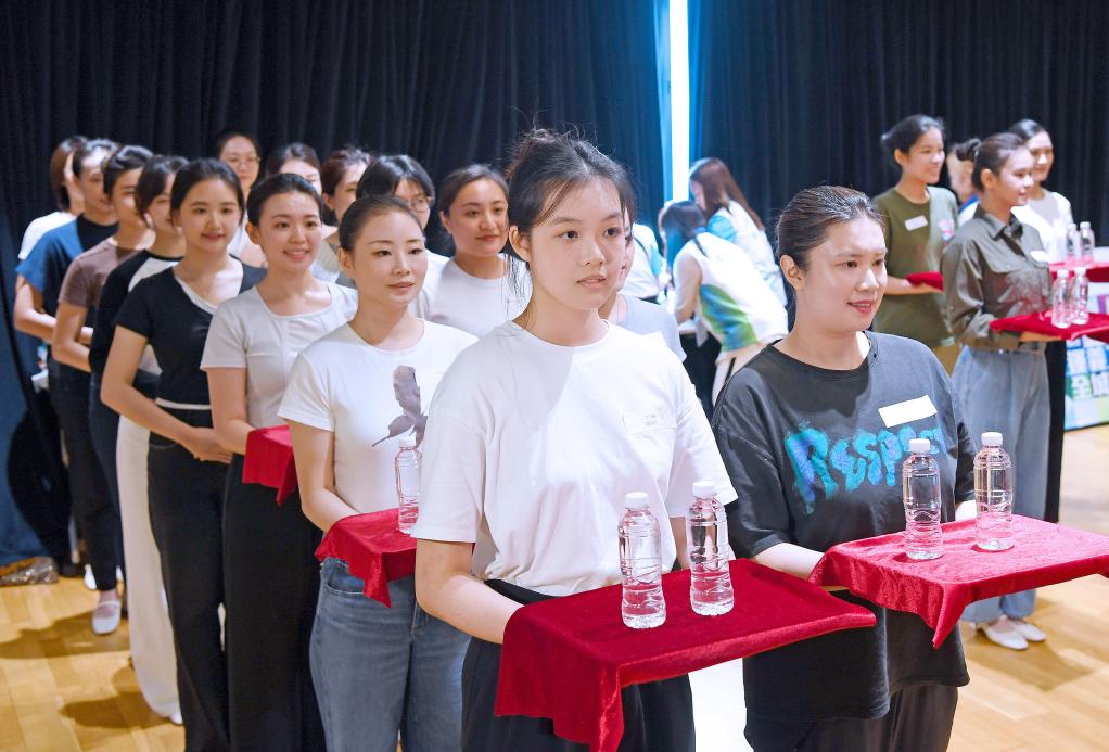 鏡面墻前,數十位禮儀助理動作整齊劃一,來自廣州的國家高級禮儀培訓師李靜穿行其間,不時俯身調整學員的手勢角度:“手位統一,步幅嚴格控制在30厘米,頒獎時才能展現最佳專業姿態?!?/p>