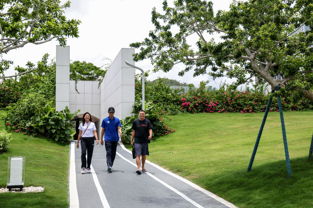 ↑2025年6月21日,天沐賽艇會的合伙人湯少文、朱銘琨和陳志鵬(由左至右)走在賽艇公園內。新華社記者 毛思倩 攝