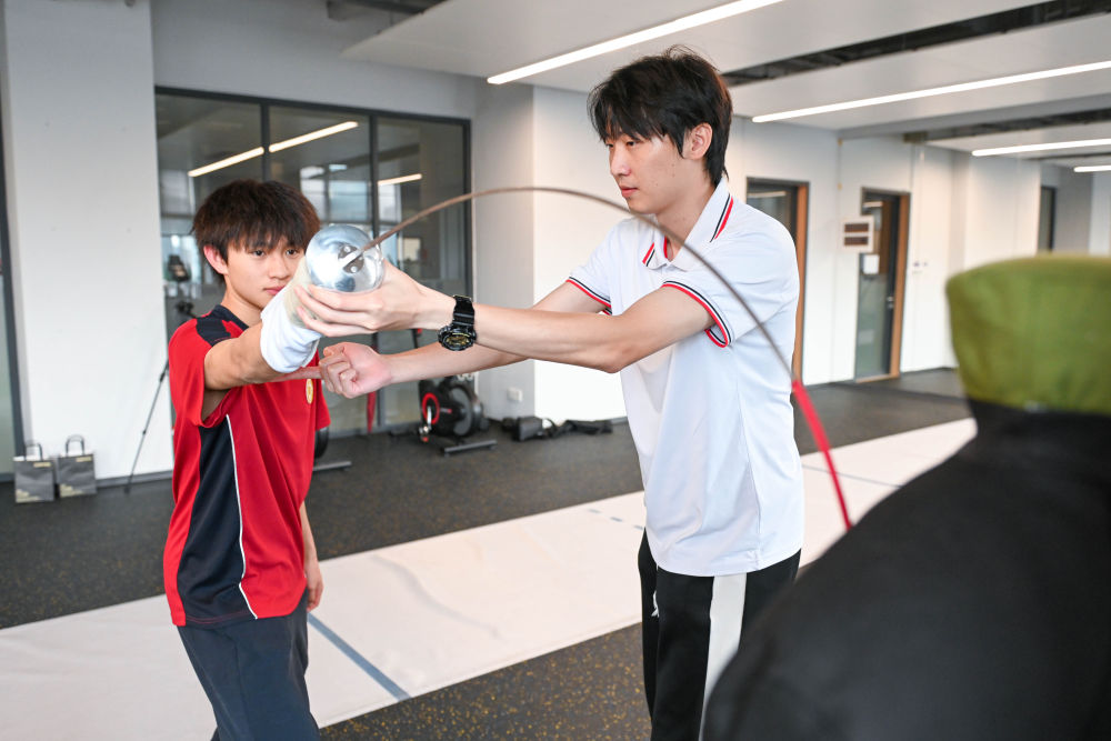 ↑2025年6月19日,廣東現代五項運動協會教練員肖勇炫(右)糾正廣州市中黃港澳子弟學校港籍生張嗣濤擊劍技術細節。新華社記者 肖恩楠 攝