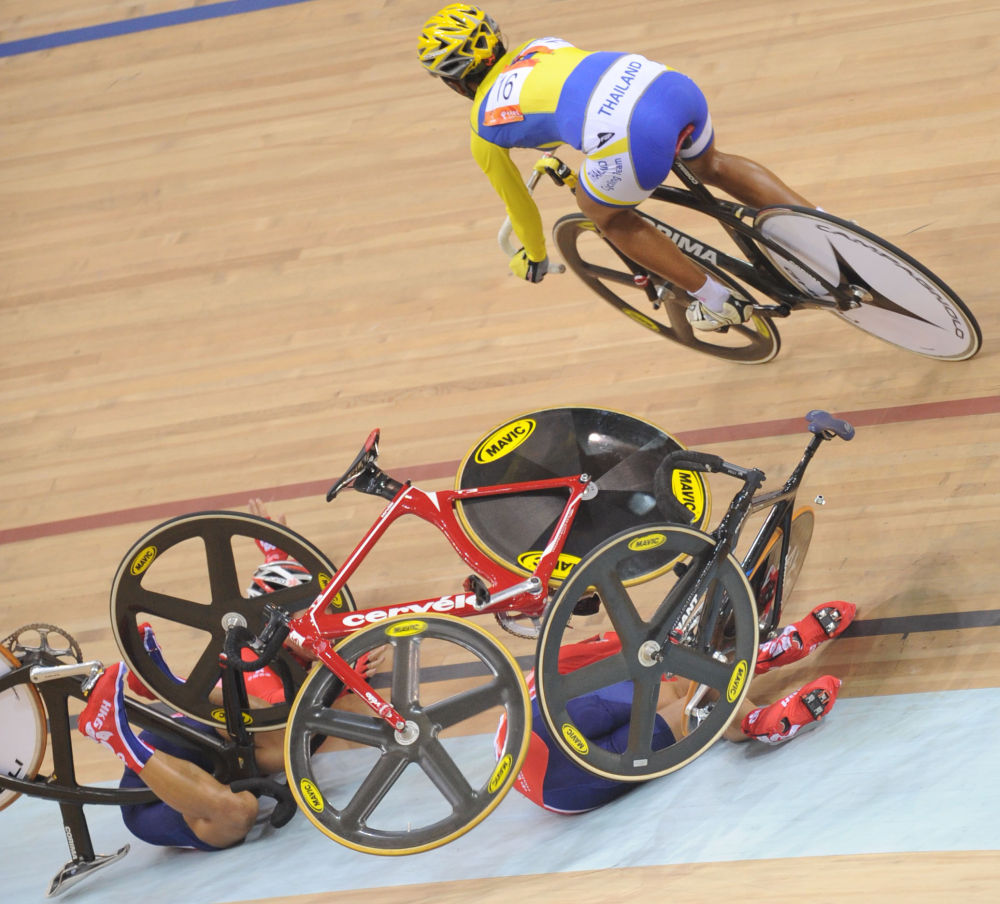↑2010年11月16日,中國香港選手黃蘊瑤(下右)在比賽中摔倒。當日,第16屆亞運會場地自行車女子記分賽發生了嚴重的車輛相撞導致車手摔倒的事故,幾名選手因傷退出比賽。新華社記者 李尕 攝
