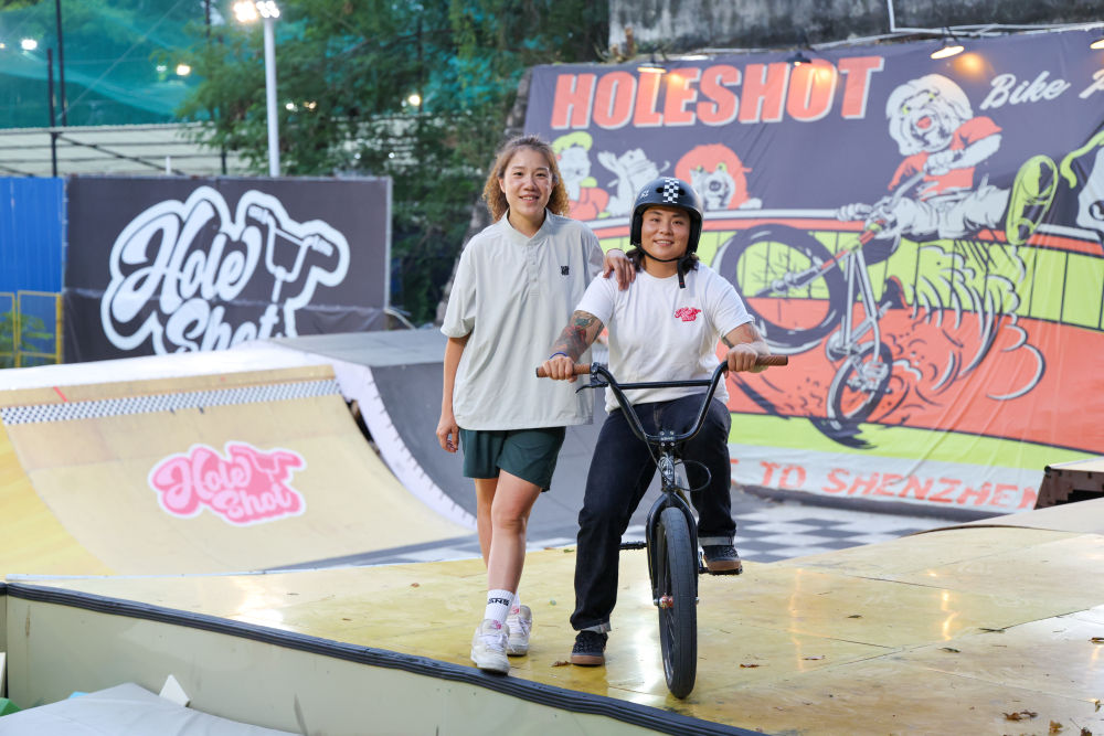 ↑2025年10月31日,黃蘊瑤(左)和她的合作伙伴王思楊子在位于深圳福田區的HOLE SHOT騎行公園內合影。新華社記者 梁旭 攝
