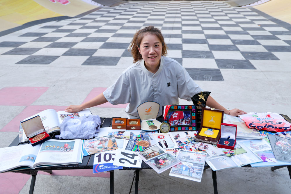 ↑2025年10月31日,在位于深圳福田區的HOLE SHOT騎行公園,黃蘊瑤展示運動員時期的獎牌和照片。新華社記者 梁旭 攝