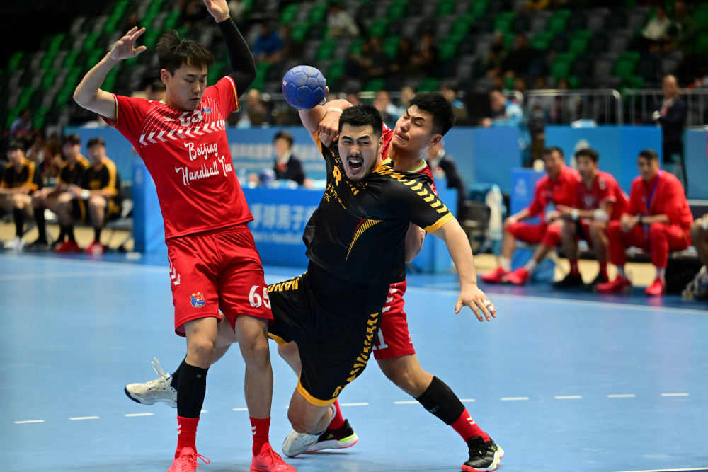 ↑2025年11月8日,江蘇隊球員謝慶龍(中)在比賽中進攻。當日,在香港進行的第十五屆全國運動會男子手球半決賽中,江蘇隊23比22戰勝北京隊。新華社記者 于洋 攝
