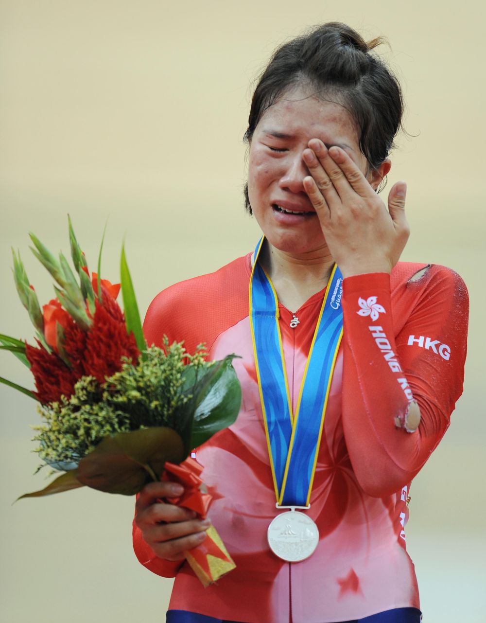 ↑2010年11月16日,中國香港選手黃蘊瑤在領獎臺上流淚。當日,第16屆亞運會場地自行車女子記分賽在廣州自行車輪滑極限運動中心進行,中國香港選手黃蘊瑤以27分的成績獲得亞軍。新華社記者 李尕 攝