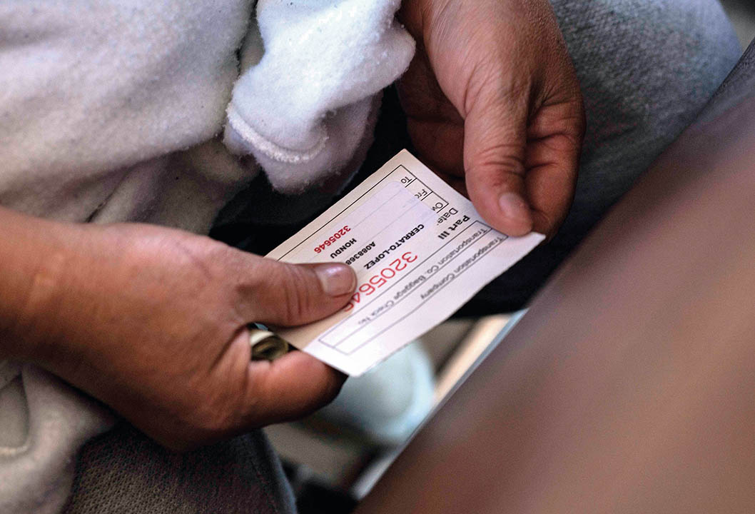 2月14 日,在洪都拉斯西北部城市圣佩德羅蘇拉的移民援助中心,一名返鄉移民手持身份證明文件
