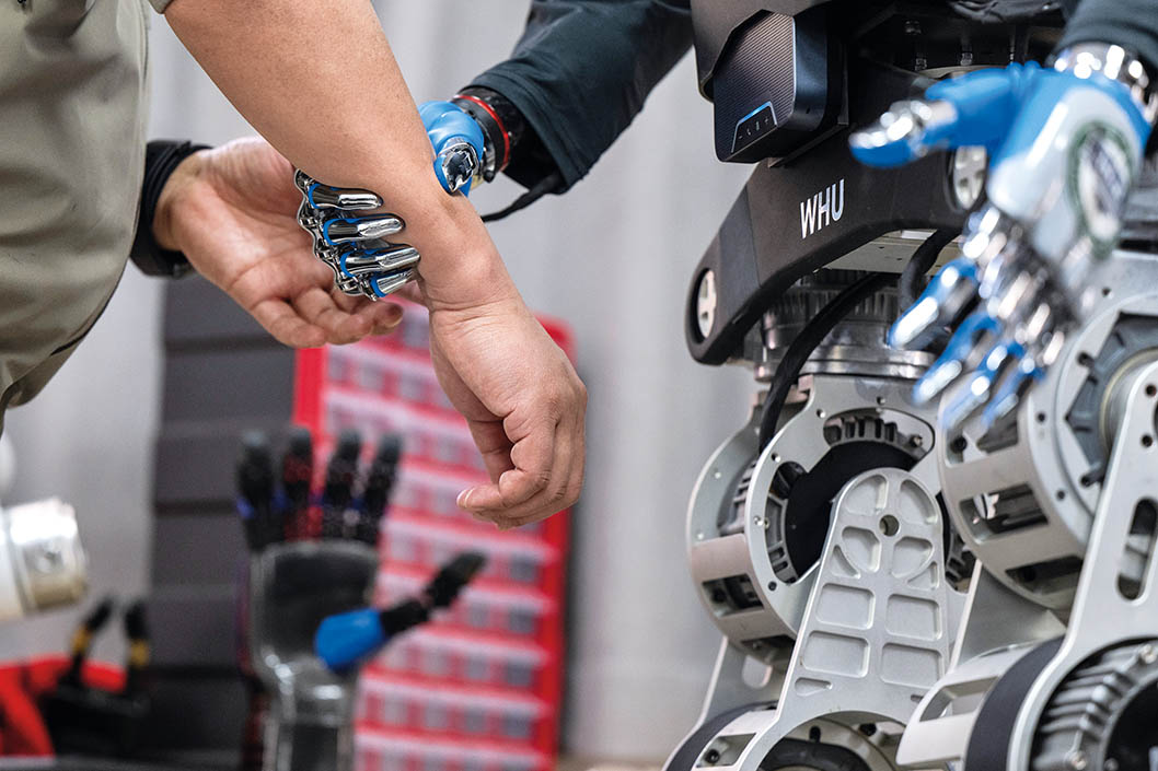 3月19日,在武漢大學機器人學習算法與軟操作實驗室內,研發團隊在對“天問”人形機器人進行研發調試