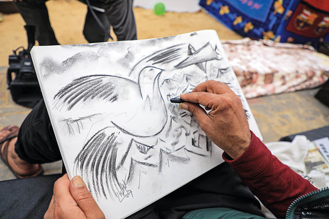 2023年12月27日,在加沙地帶南部城市拉法,巴勒斯坦畫家巴西勒·馬古西正在創作
