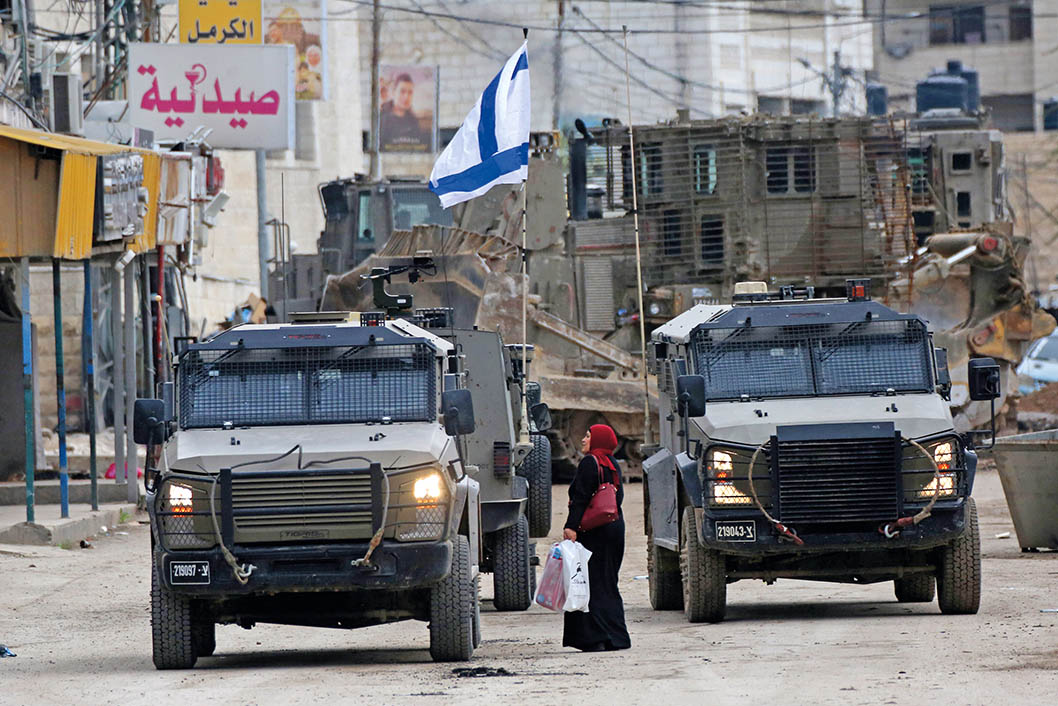 1月22日,在約旦河西岸北部杰寧,一名巴勒斯坦婦女走過以軍車輛
