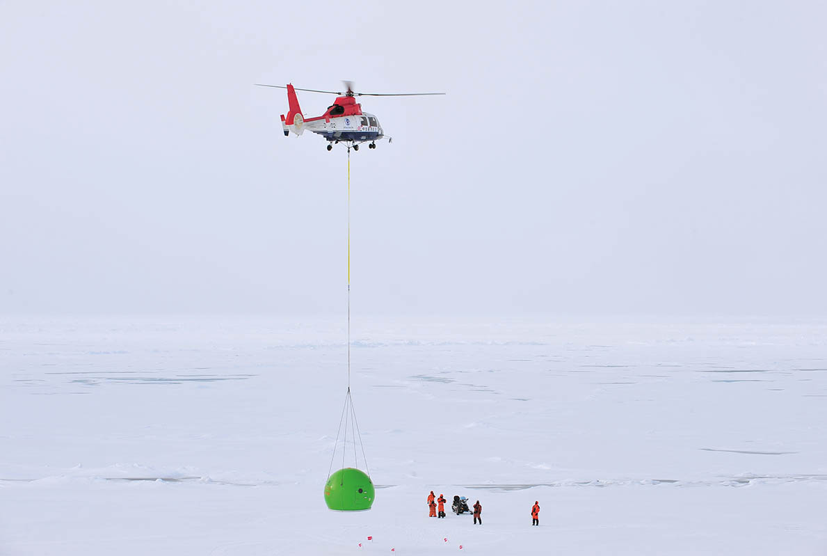 2010年8月8日,中國第四次北極科考隊作業過程中,“海豚”直升機將“防熊”的“蘋果房”吊運到作業現場