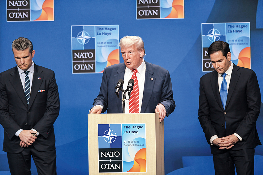 6 月 25 日,美國總統特朗普(中)在荷蘭海牙出席記者會