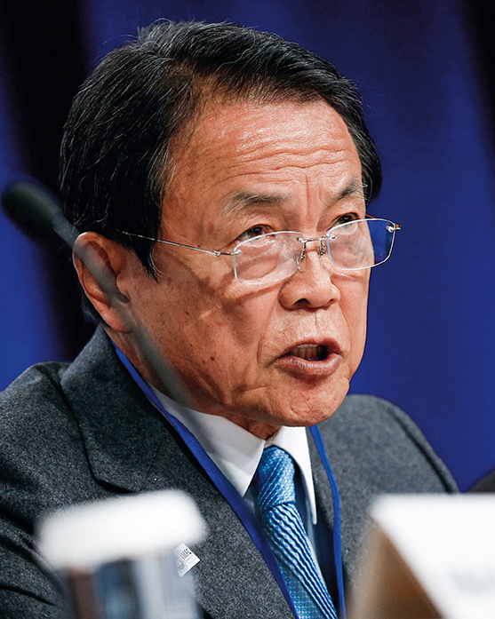 2019 年 4 月 12 日,在美國華盛頓,當時的日本副首相兼財務大臣麻生太郎在新聞發布會上發言