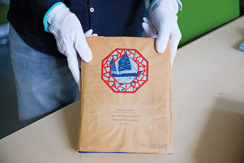7月30日,在位于德國柏林的西門子歷史檔案館,歷史學家埃瓦爾德· 布勒歇爾展示《拉貝日記》部分原件