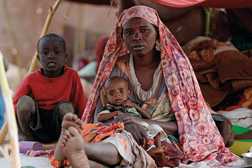 7月9日,在蘇丹北達爾富爾州法希爾,一名女子抱著營養不良的兒童