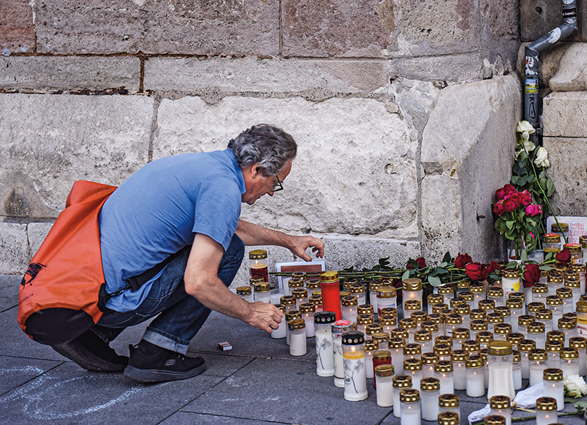 6月11日,在奧地利首都維也納,一名男子在斯蒂芬教堂廣場擺放蠟燭,悼念校園槍擊案遇難者。6月10日上午10時許,奧地利第二大城市格拉茨一所學校發生槍擊事件,導致包括槍手在內的11人死亡