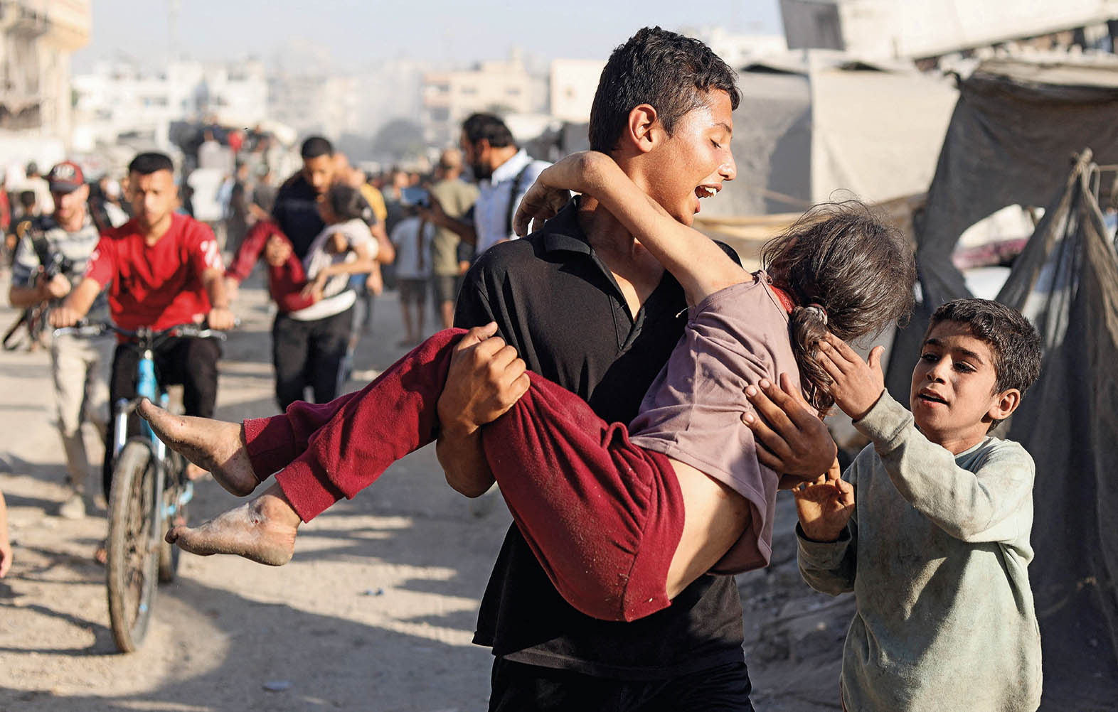 9 月 7 日,在加沙城中的一座流離失所者臨時營地,一名男孩懷抱一名受傷的女孩