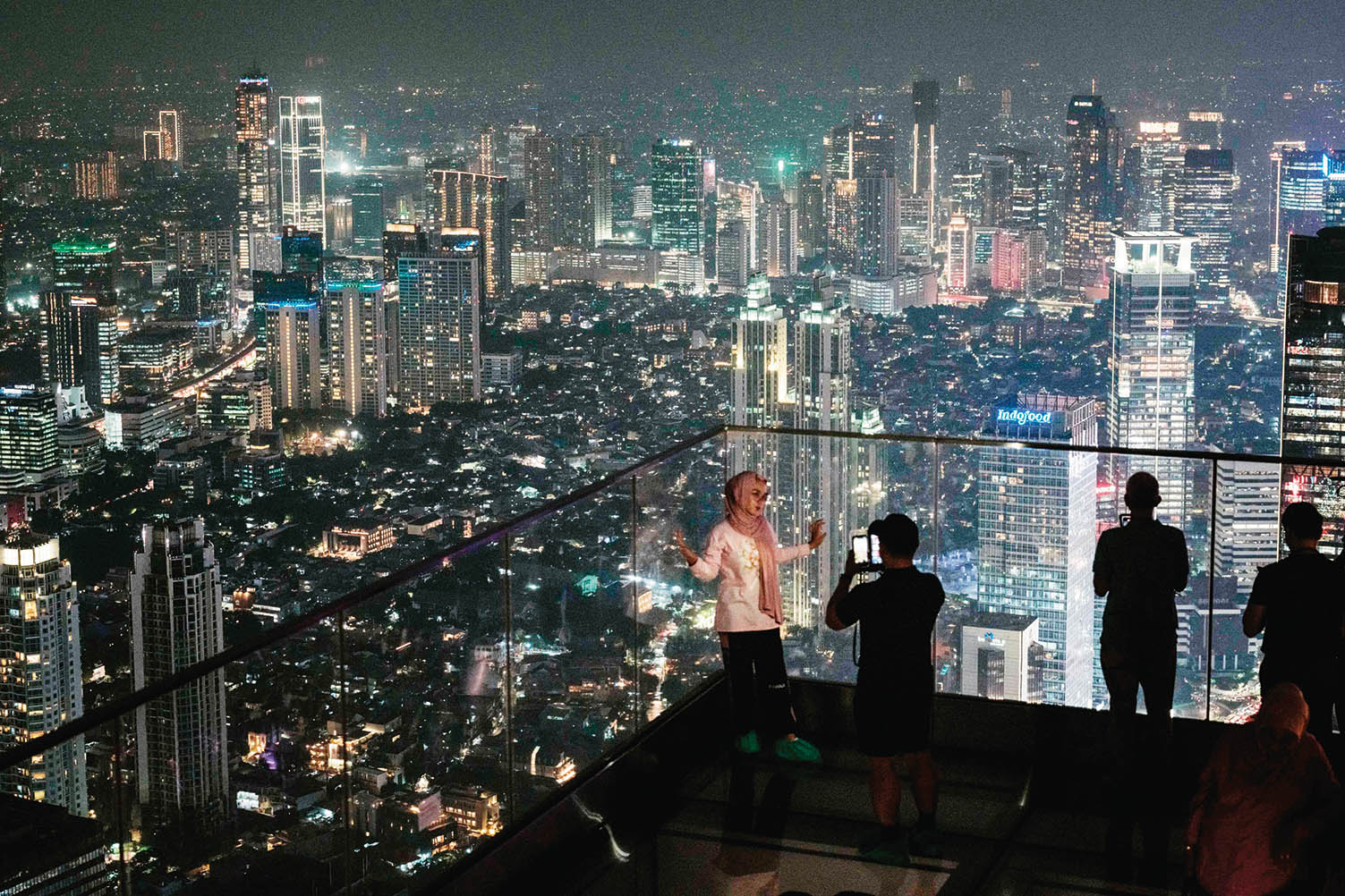 7月24日,人們在印度尼西亞雅加達一棟高樓上欣賞城市風光