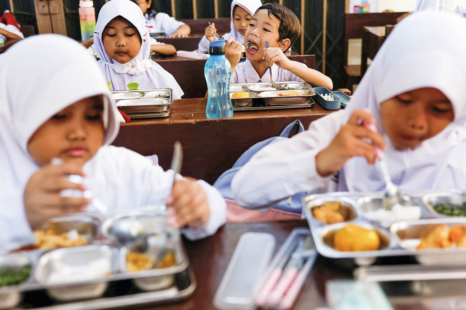 1月6日,學生在印度尼西亞雅加達的學校里吃營養餐。印度尼西亞政府2025年1月6日正式啟動免費營養餐計劃