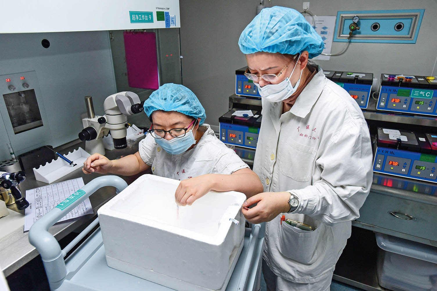 2017 年 3 月 20 日,廣州醫科大學附屬第三醫院胚胎實驗室人員杜紅姿(右)和陳仕萍核對從冷凍庫里提取的胚胎