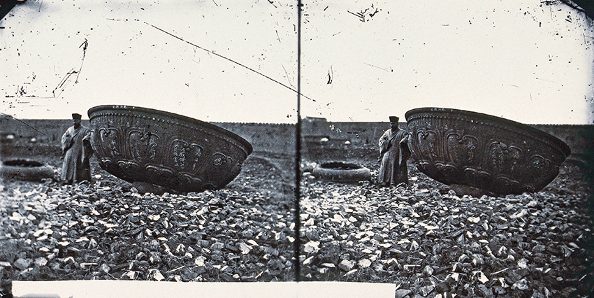 如果湯姆森早15年到此,他將望見一座高78米、九層八面的寶塔——明朝皇帝朱棣為紀念其母親而建的大報恩寺琉璃塔。但湯姆森看到的只有廢墟。1856年,戰火讓寺塔盡毀,留下照片中這只原置于塔頂、收集雨水的承露盤。