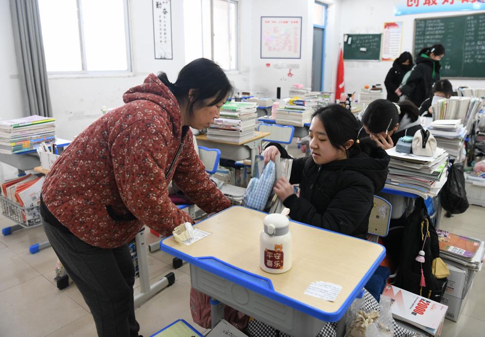 在宿城一中宿馬學校,媽媽許成香送王子文到教室上課(2024年12月12日攝)。