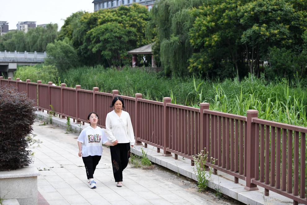 5月25日,在宿城一中宿馬學校,王子文(左)和媽媽許成香散步。