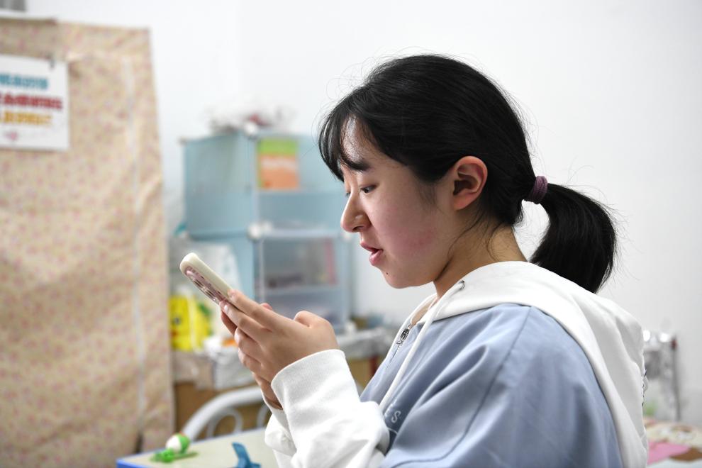 5月25日,在宿城一中宿馬學校宿舍,王子文用手機查資料。