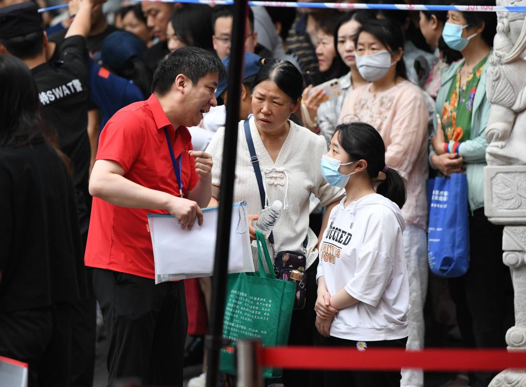 6月7日,在宿州市的一處高考考點外,王子文和班主任王龍(左)交流。
