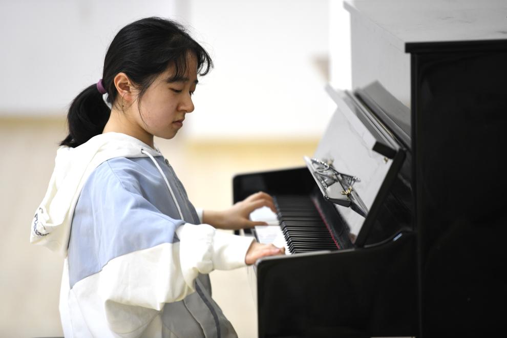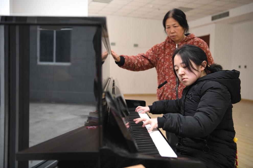 在宿城一中宿馬學校的音樂室,王子文在媽媽許成香的陪伴下彈鋼琴(2024年12月12日攝)。