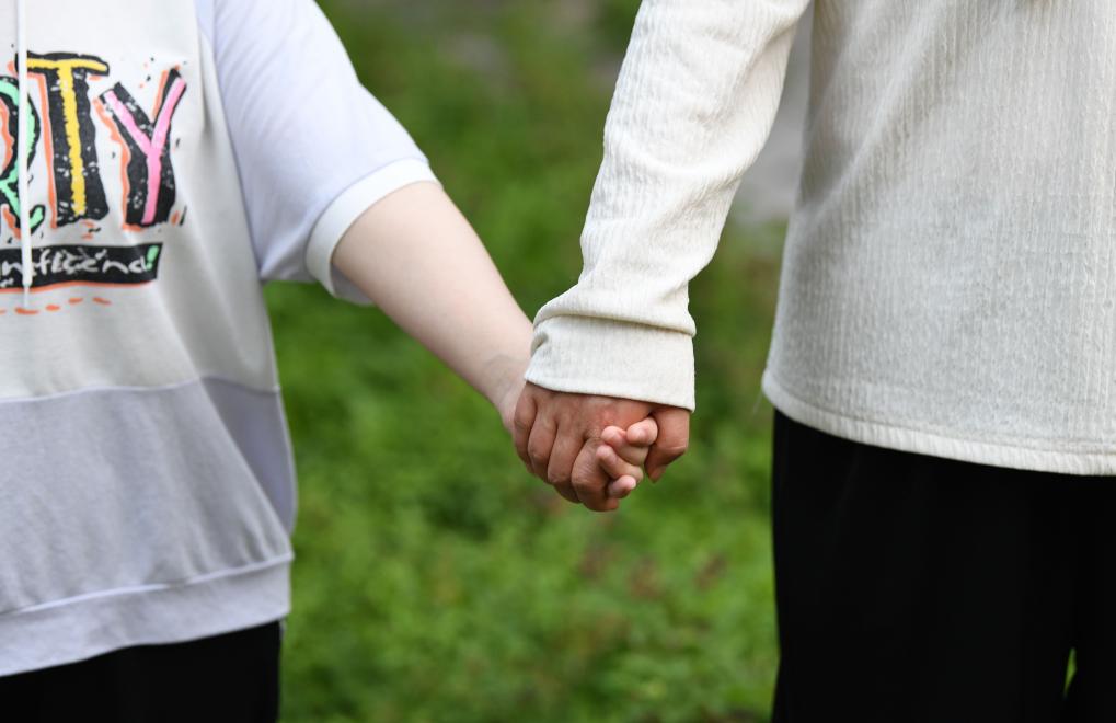 5月25日,在宿城一中宿馬學校,媽媽許成香拉著王子文(左)的手散步。