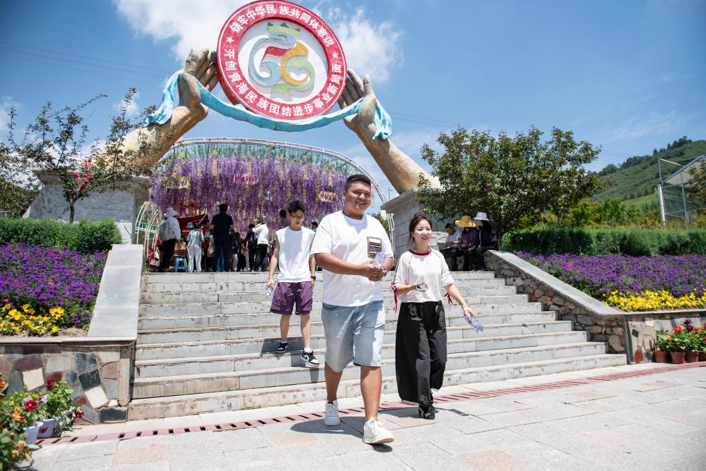 7月22日,游客在大通縣邊麻溝花海景區游覽。