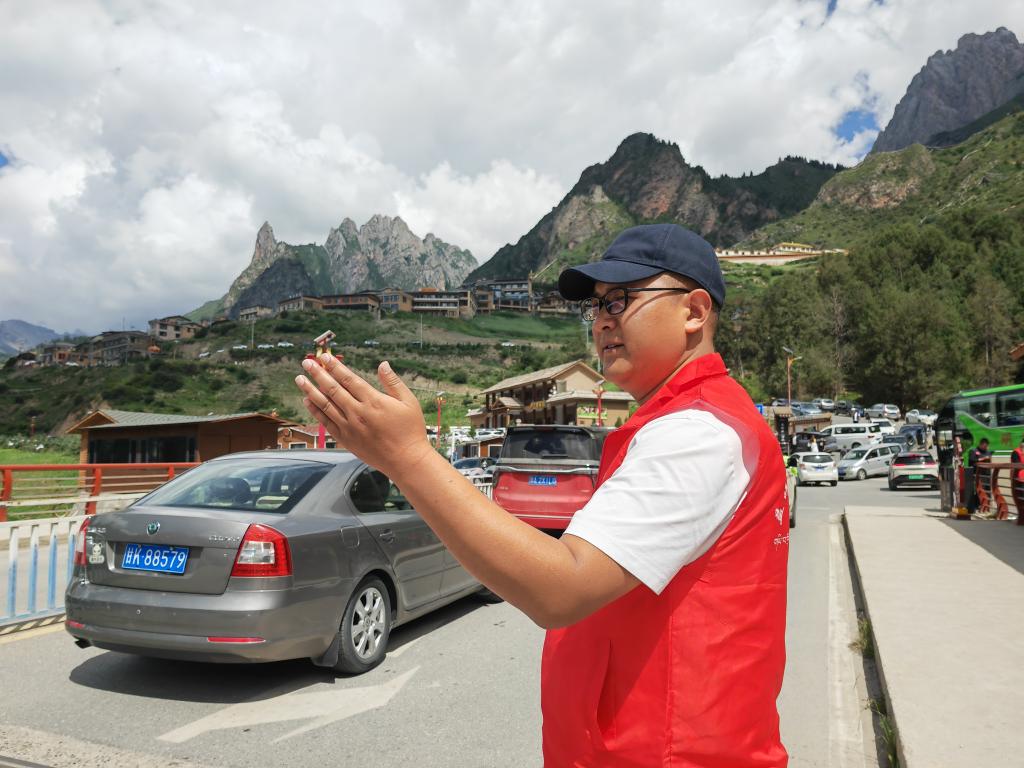熙熙攘攘中,有群“紅馬甲”在忙前忙后。他們疏導交通、提供志愿講解、給游客調解旅途中出現的各類糾紛,哪里有需要他們就出現在哪里。扎尕那村黨支部書記班代交便是其中一員。