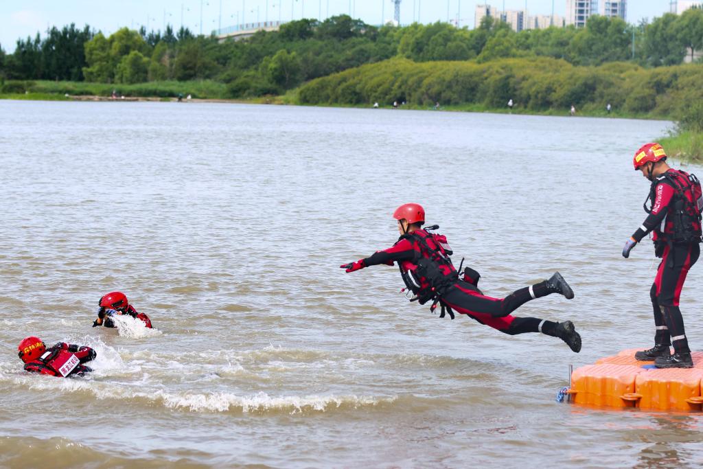 8月5日,參演消防員在松花江哈爾濱段進行入水演練。