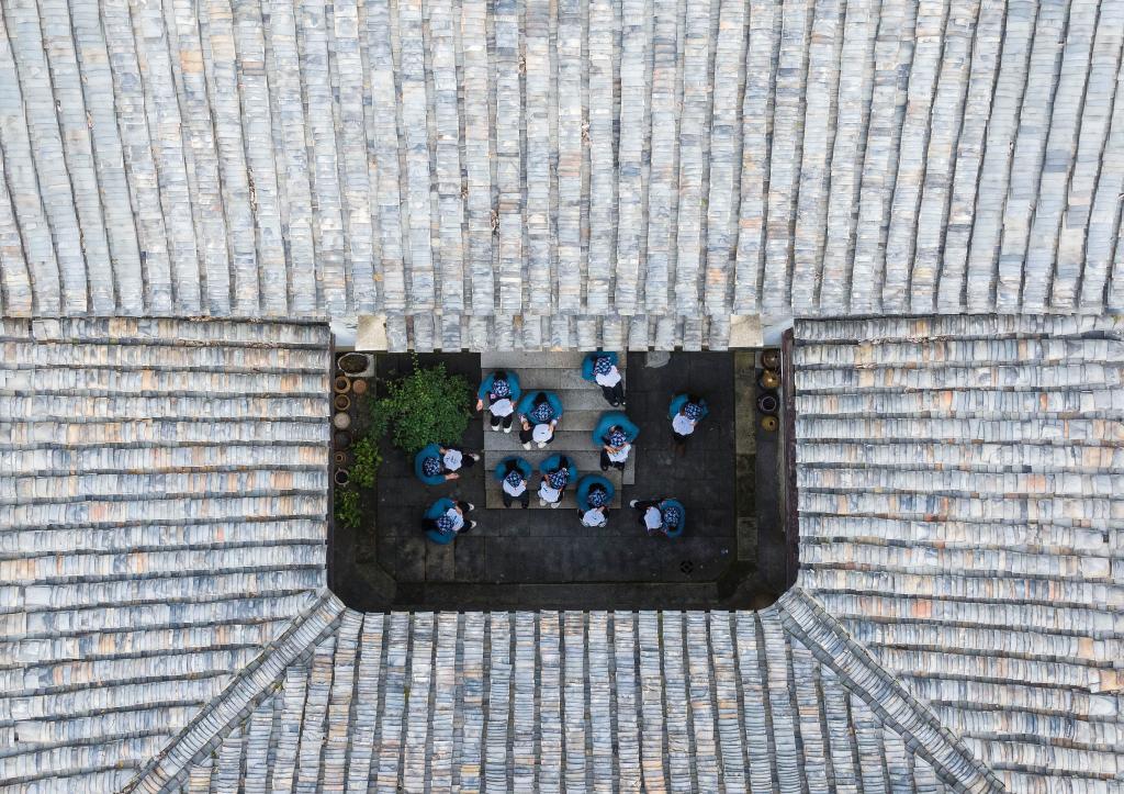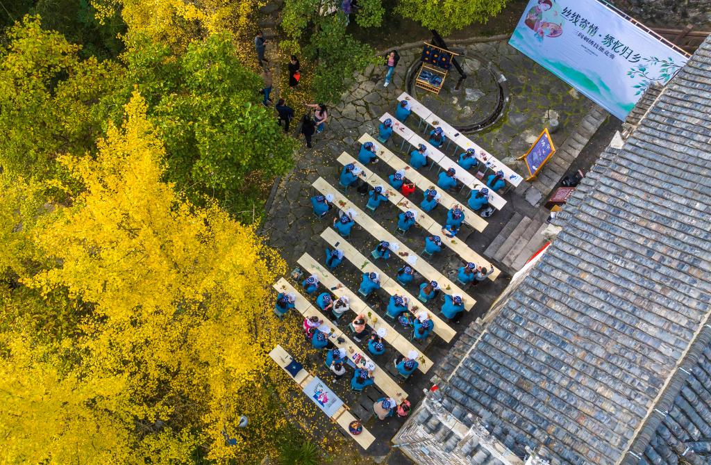 11月2日,繡娘代表在湖北省宜昌市秭歸縣屈原故里景區羋繡館參加刺繡技藝比賽(無人機照片)。