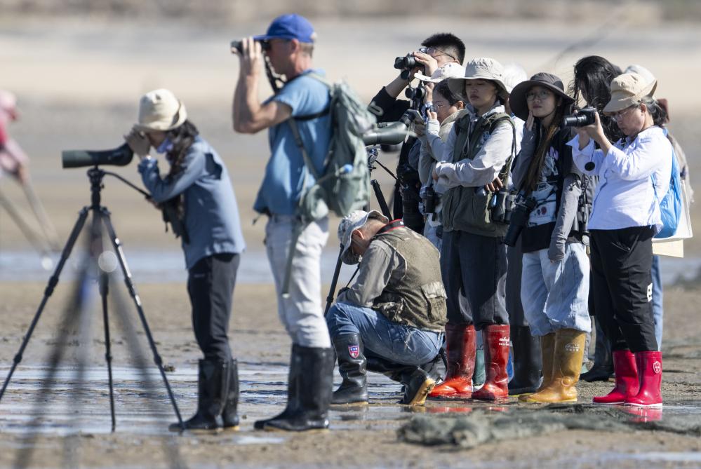 11月9日,中外觀鳥愛好者在泉州圍頭灣灘涂上觀測勺嘴鷸。