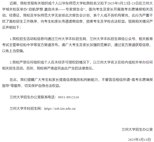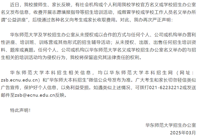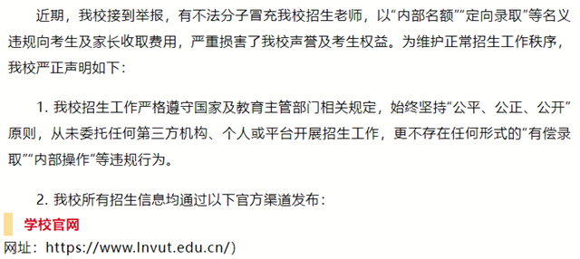多所高校通過官方渠道發表聲明,鄭重提醒廣大考生及家長務必保持高度警惕,增強防范意識,切勿輕信這些虛假宣傳,謹防陷入詐騙陷阱,切實維護自身的合法權益。相關聲明一起看——