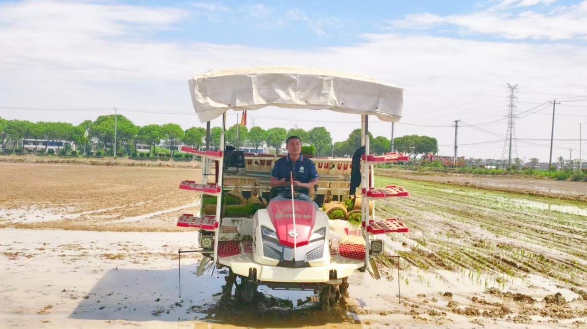 新華網北京6月25日電(記者 李雪芹) 芒種至,農忙始。長江以南,一群群白鷺掠過江蘇省無錫江陰市周莊鎮的一片片綠田,令人頓起“守拙歸園田”之意。不遠處,被大家稱為“米哥”的新農人程雪峰正駕駛著插秧機在水田里穿梭。只見車輪駛過之處,嫩綠的秧苗整齊列隊,他則像一位神器在手、成竹在胸的指揮家,在希望的田野上,奏響鄉村振興的動人樂章。