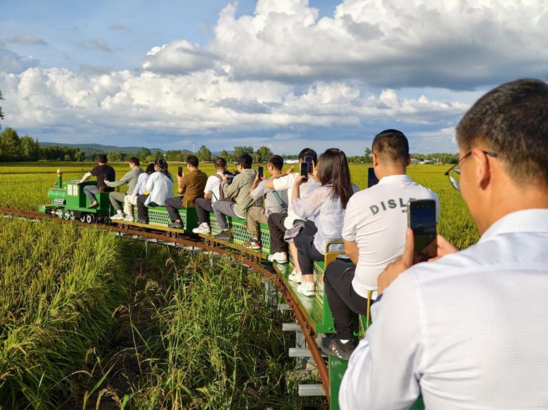 2025年8月25日,游客在黑龍江省伊春鐵力市工農鄉北星村的稻田小火車上游玩。新華網記者 鐘奕 攝