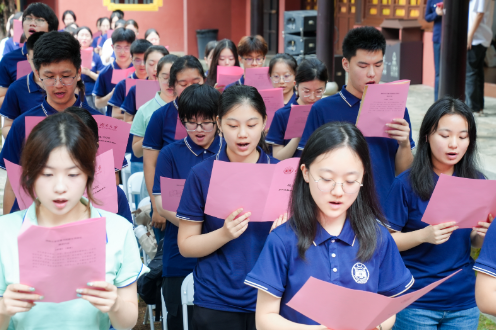 9月27日上午,湖南大學岳麓書院在文廟舉行2025年本科生導師聘任儀式暨拜師禮,圖為活動現場新生誦讀學規。湖南大學供圖