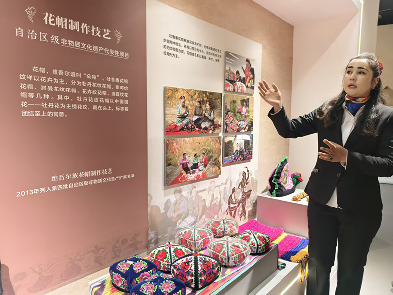 2025年10月18日,麥然木古麗·沙塔爾正在講解花帽故事。新華網記者李雪芹 攝