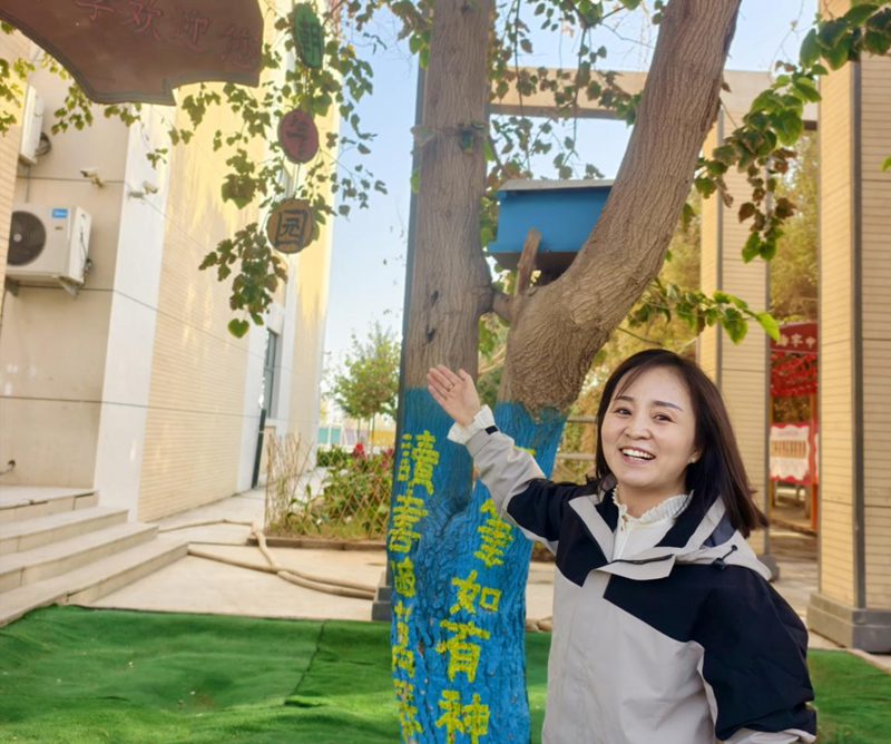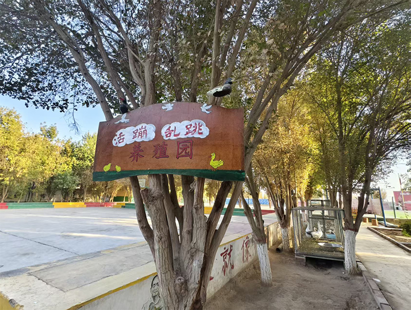 抵達吐魯番的首日,采訪組便前往艾丁湖希望小學。這所距中國海拔最低點艾丁湖僅17公里的鄉村學府,今年5月剛獲評 “全國文明校園”,校園里的每一處細節都透著對孩子們天性的呵護。一進校門,“朝氣園”里的樹身上,手繪的小動物與卡通人物躍然其上,色彩鮮艷、童趣盎然;而“活蹦亂跳園”里,住著雞鴨等小動物,很難想象這個受孩子們追捧的養殖專區,曾因名字“土氣”被嫌棄,而校方最終采用了孩子們的命名。