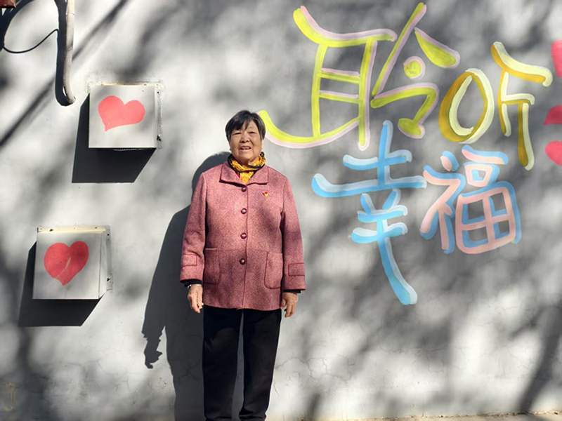 2025年10月18日,劉玉華老人在社區里的網紅墻下“聆聽幸?!?。新華網記者李雪芹 攝