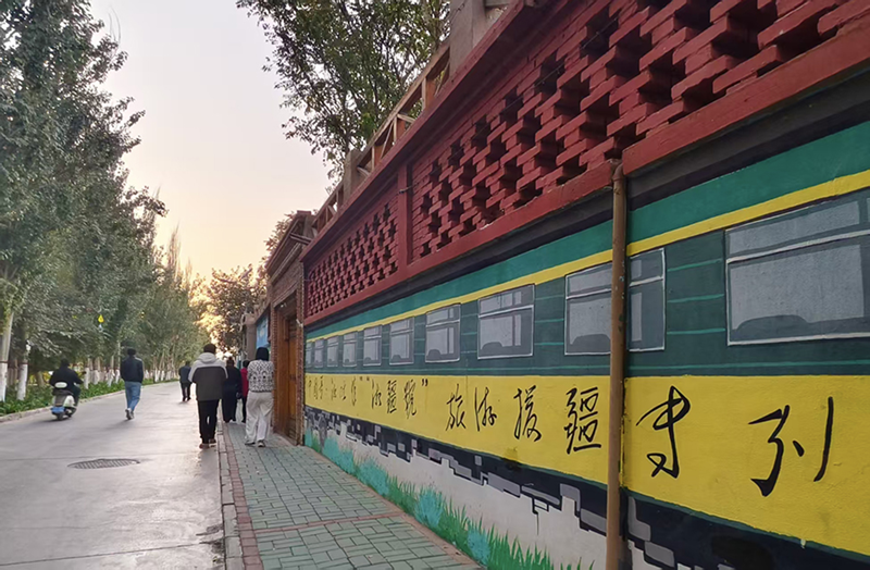 2025年10月17日,吐魯番市高昌區亞爾鎮新城西門村墻繪上的援疆元素。新華網記者李雪芹 攝
